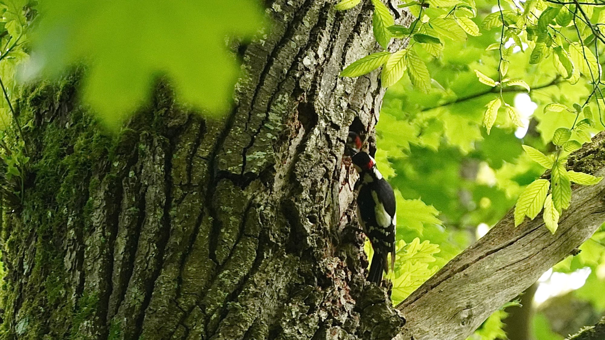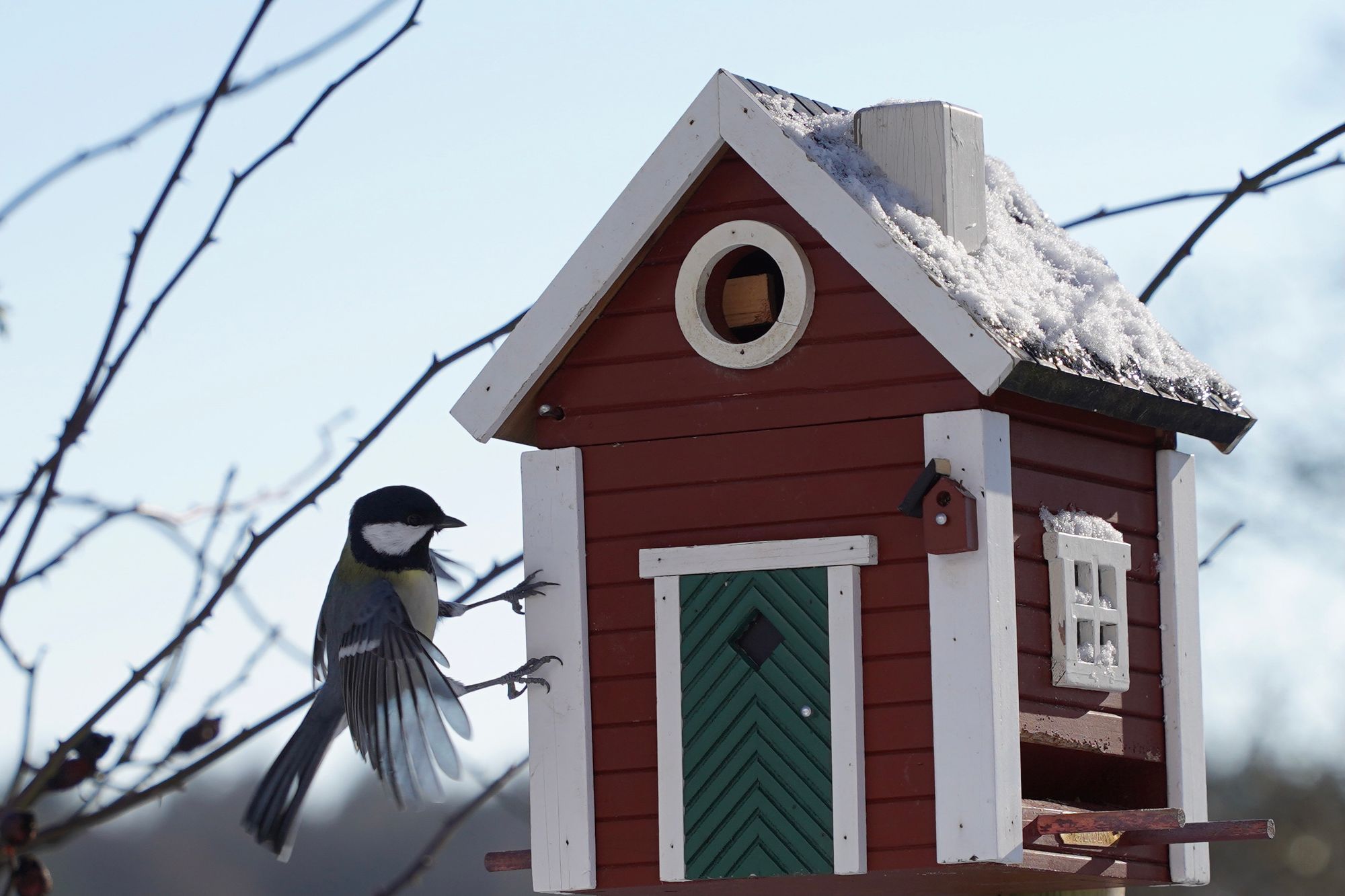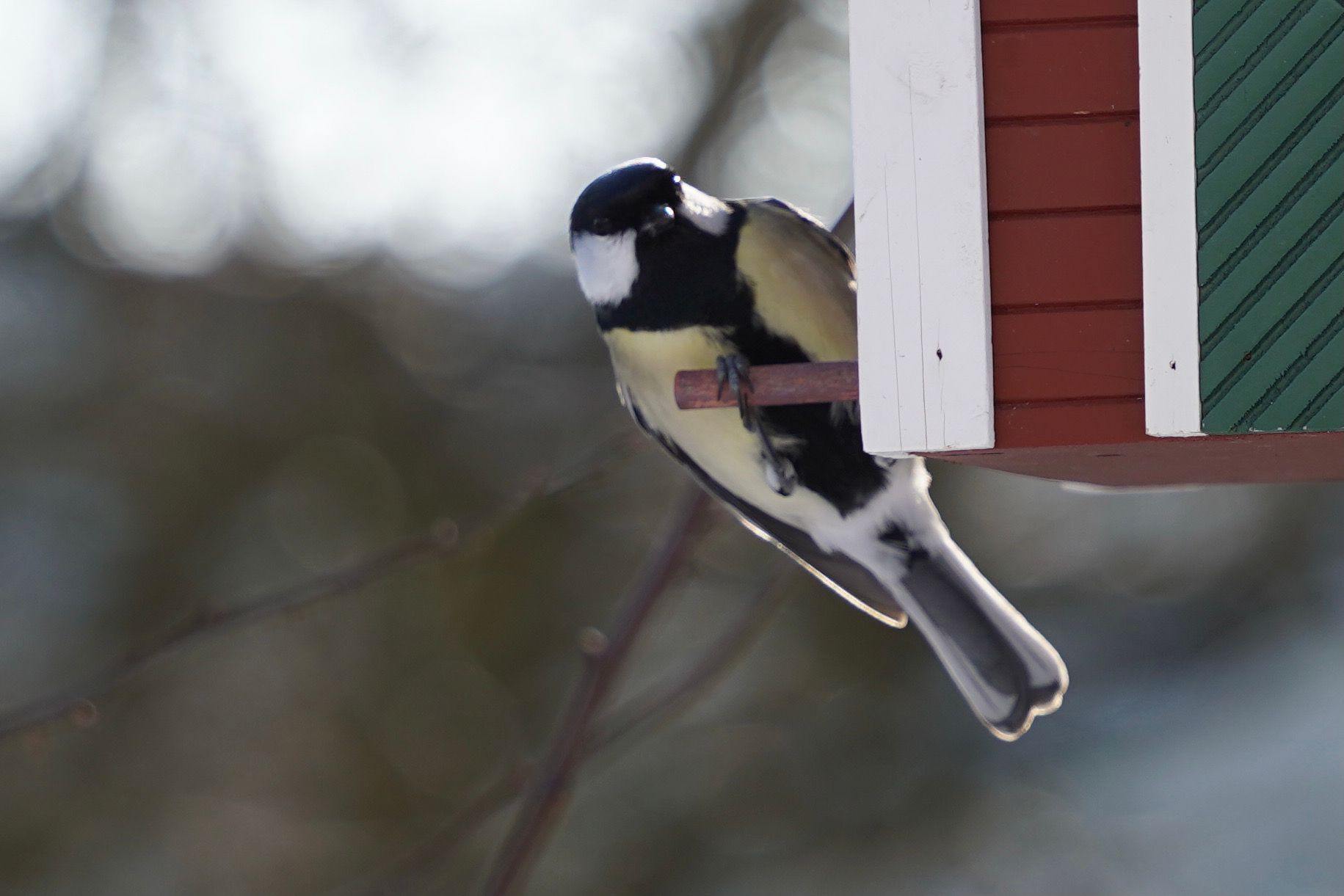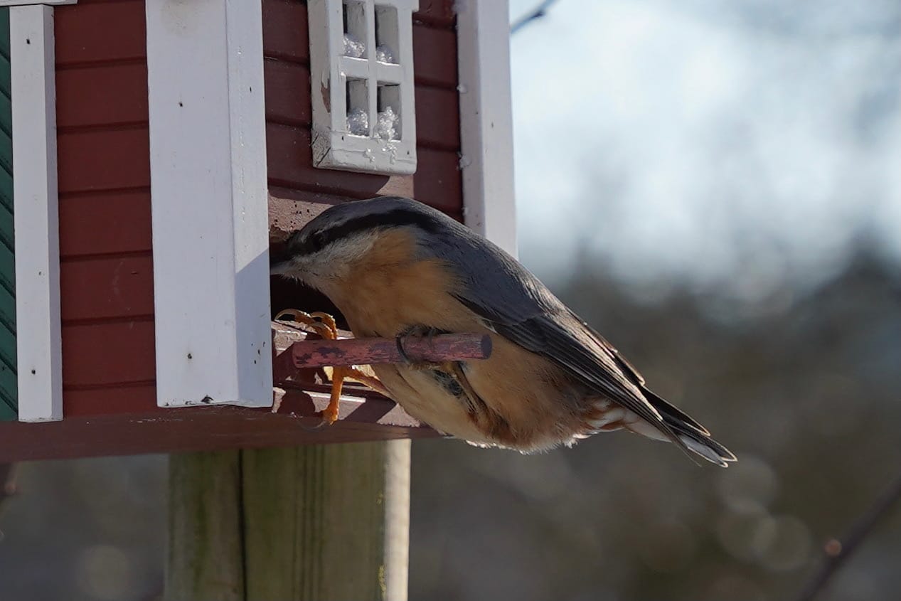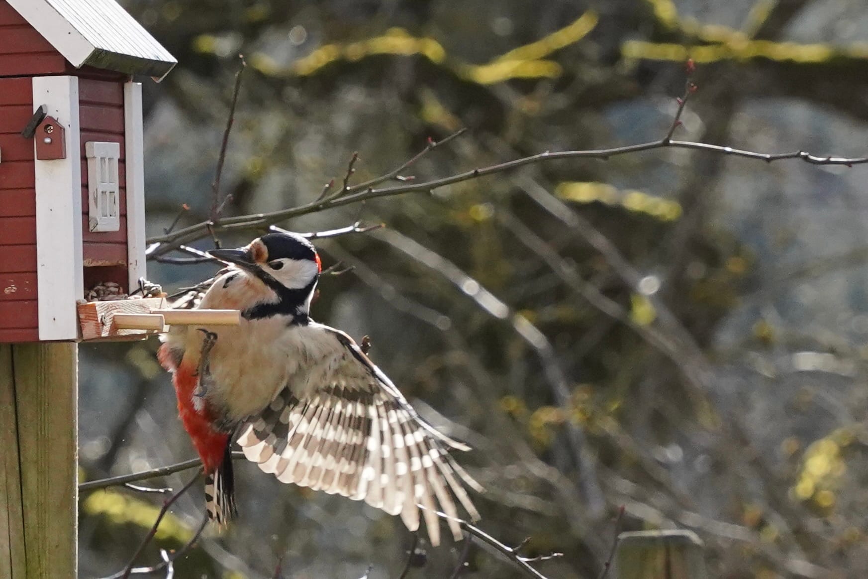 Unser Nachbar ist ein Buntspecht. Ab und zu lässt er sich blicken. Wohnt ein einer alten Eiche. Er ist übrigens auch verantwortlich für die Renovierung unseres Schwedenhaus-Futterhäuschens. Da hat er versucht, ein Loch rein zu graben. Jetzt haben wir ein neues. Nein, kein neues Loch, ein neues Häuschen. Noch.