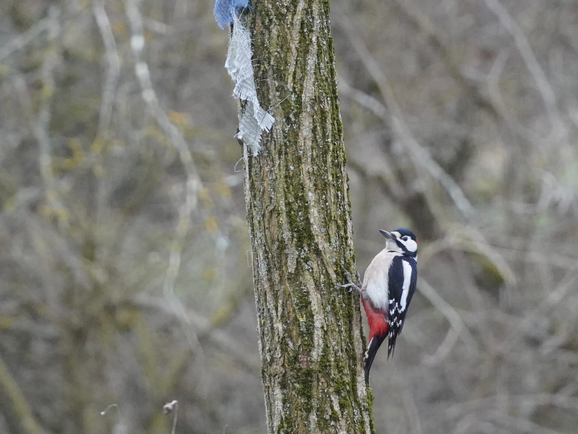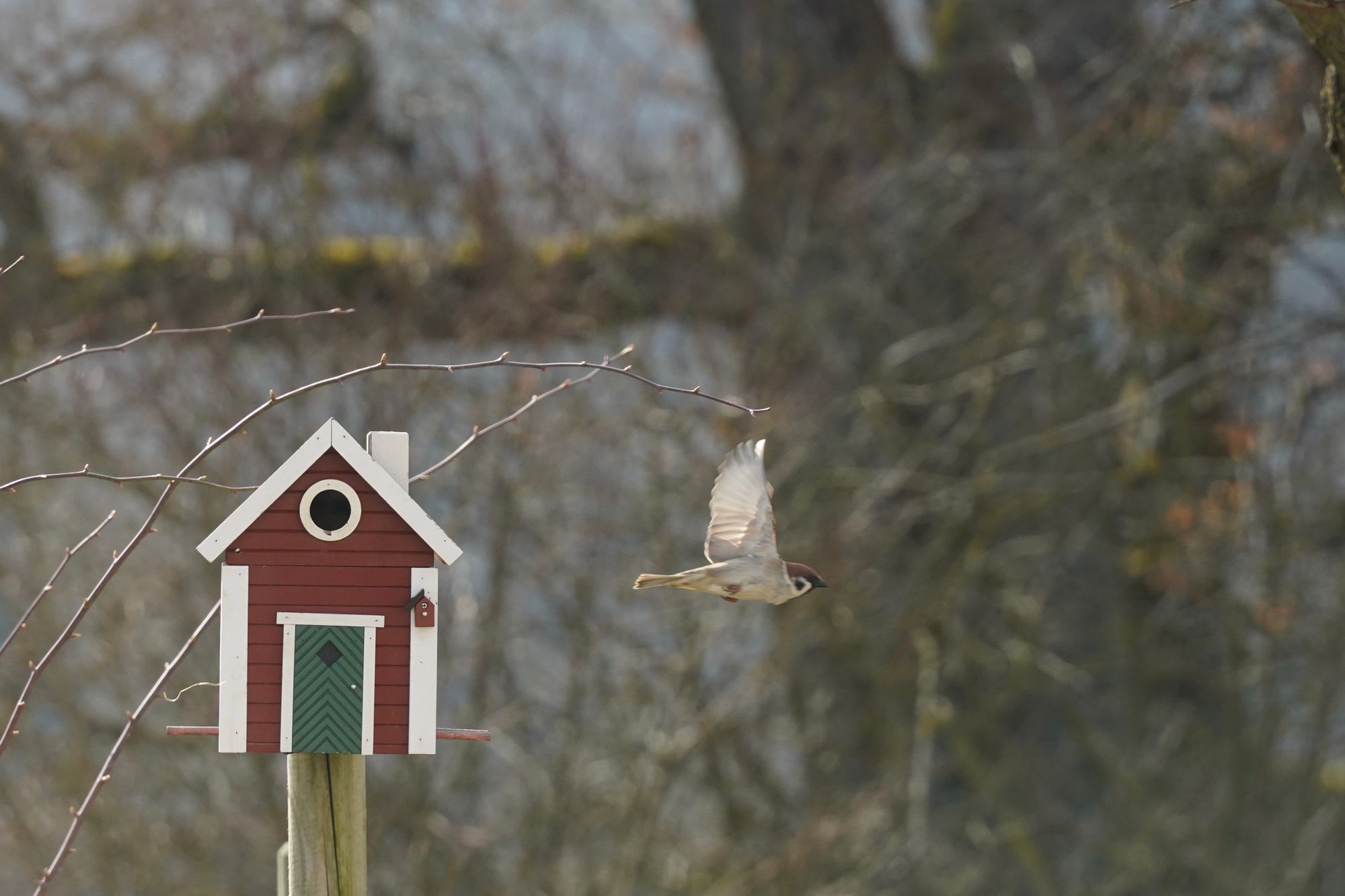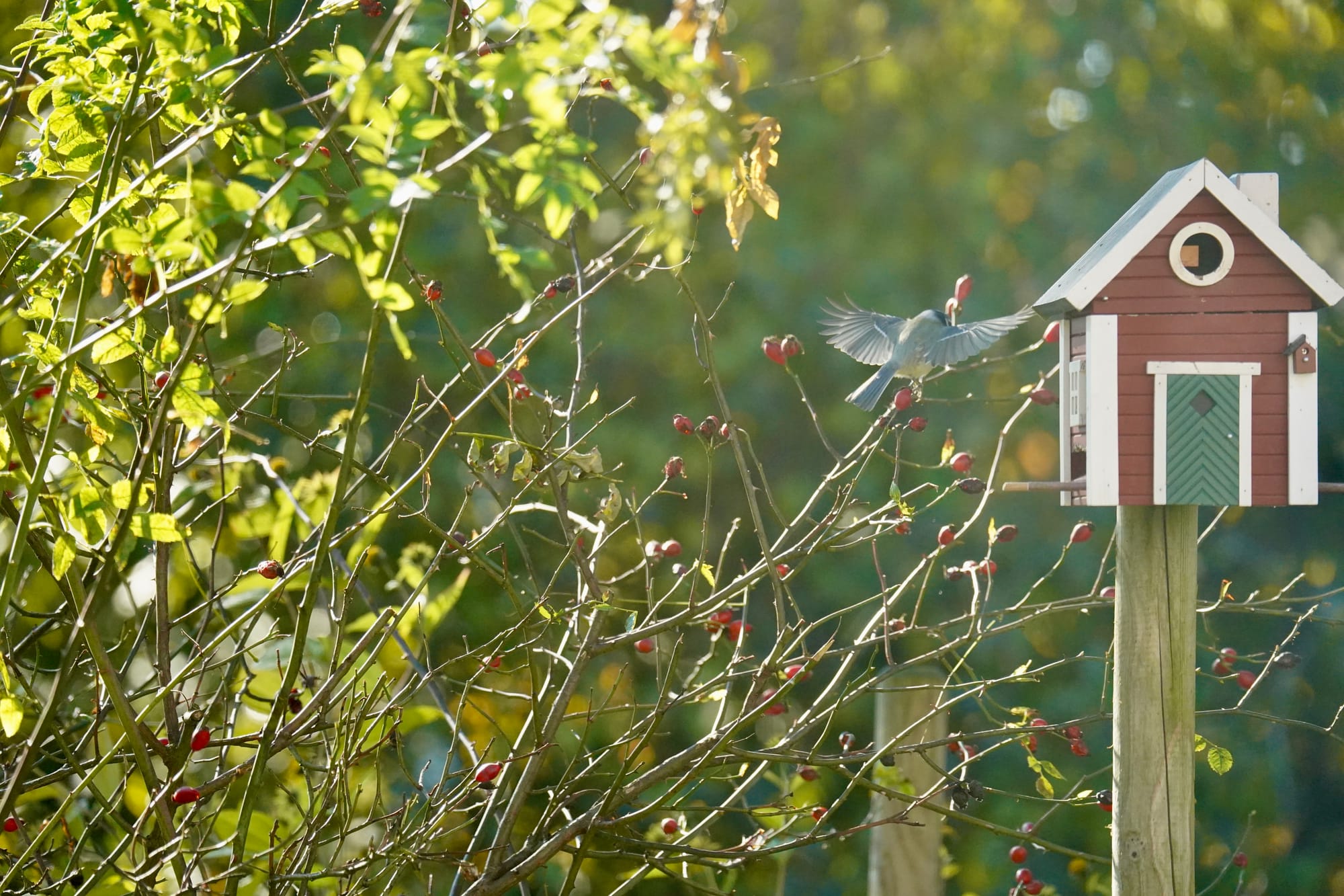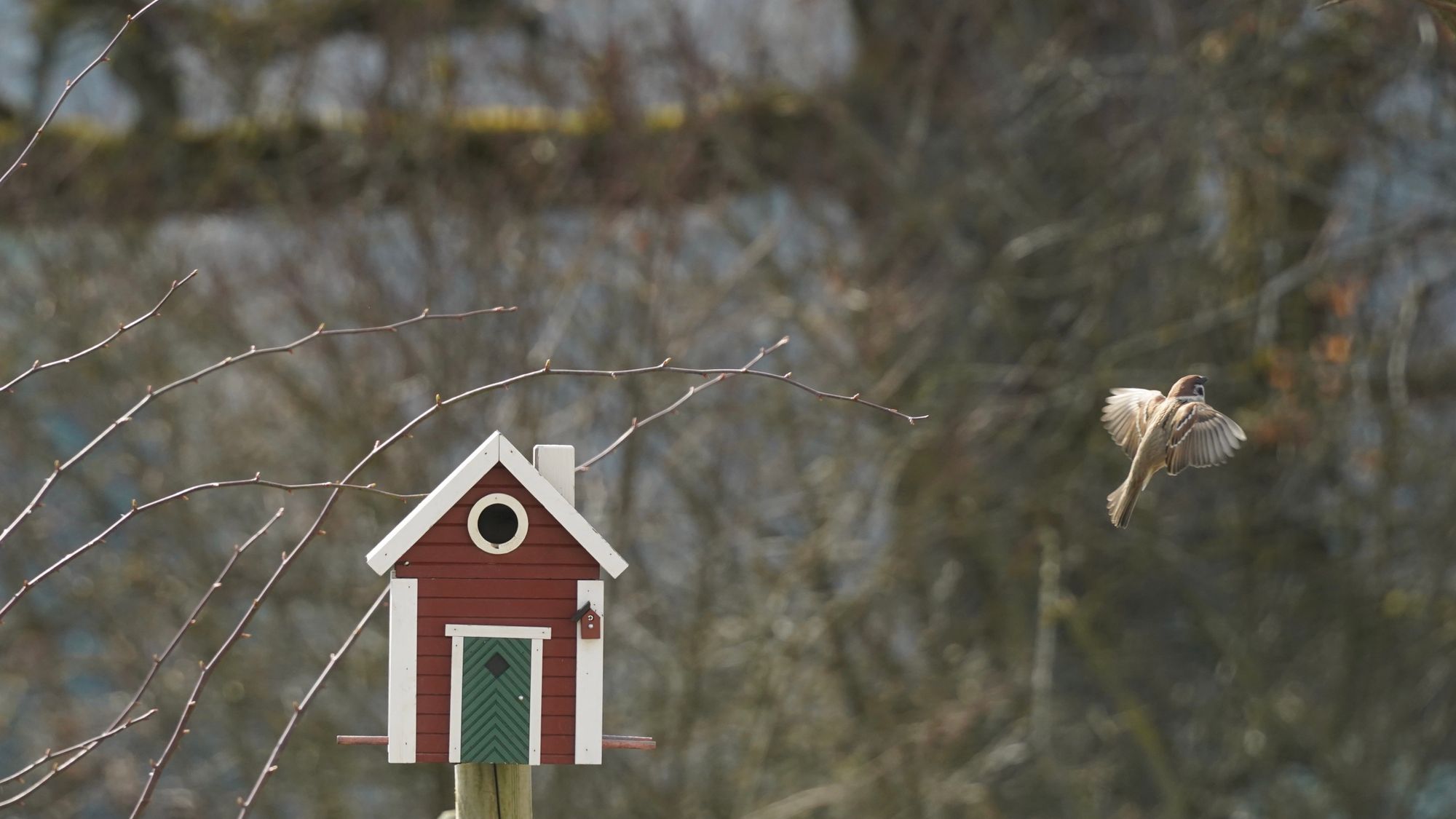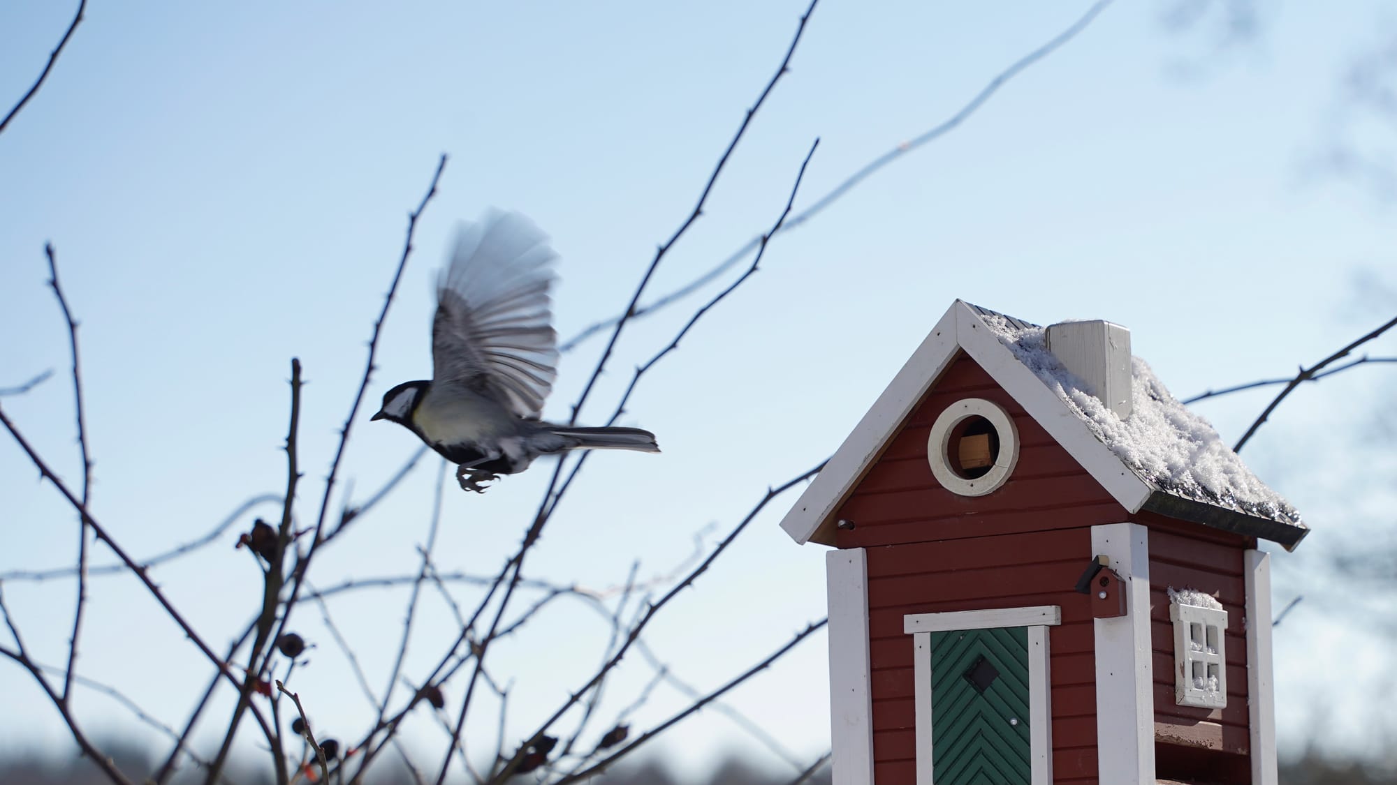 Unser Nachbar ist ein Buntspecht. Ab und zu lässt er sich blicken. Wohnt ein einer alten Eiche. Er ist übrigens auch verantwortlich für die Renovierung unseres Schwedenhaus-Futterhäuschens. Da hat er versucht, ein Loch rein zu graben. Jetzt haben wir ein neues. Nein, kein neues Loch, ein neues Häuschen. Noch.