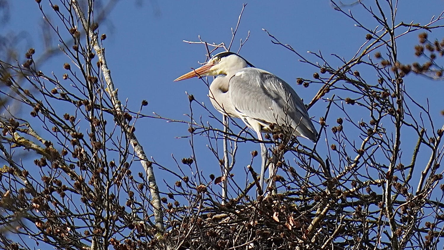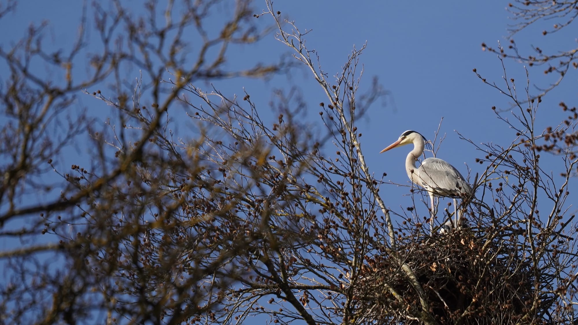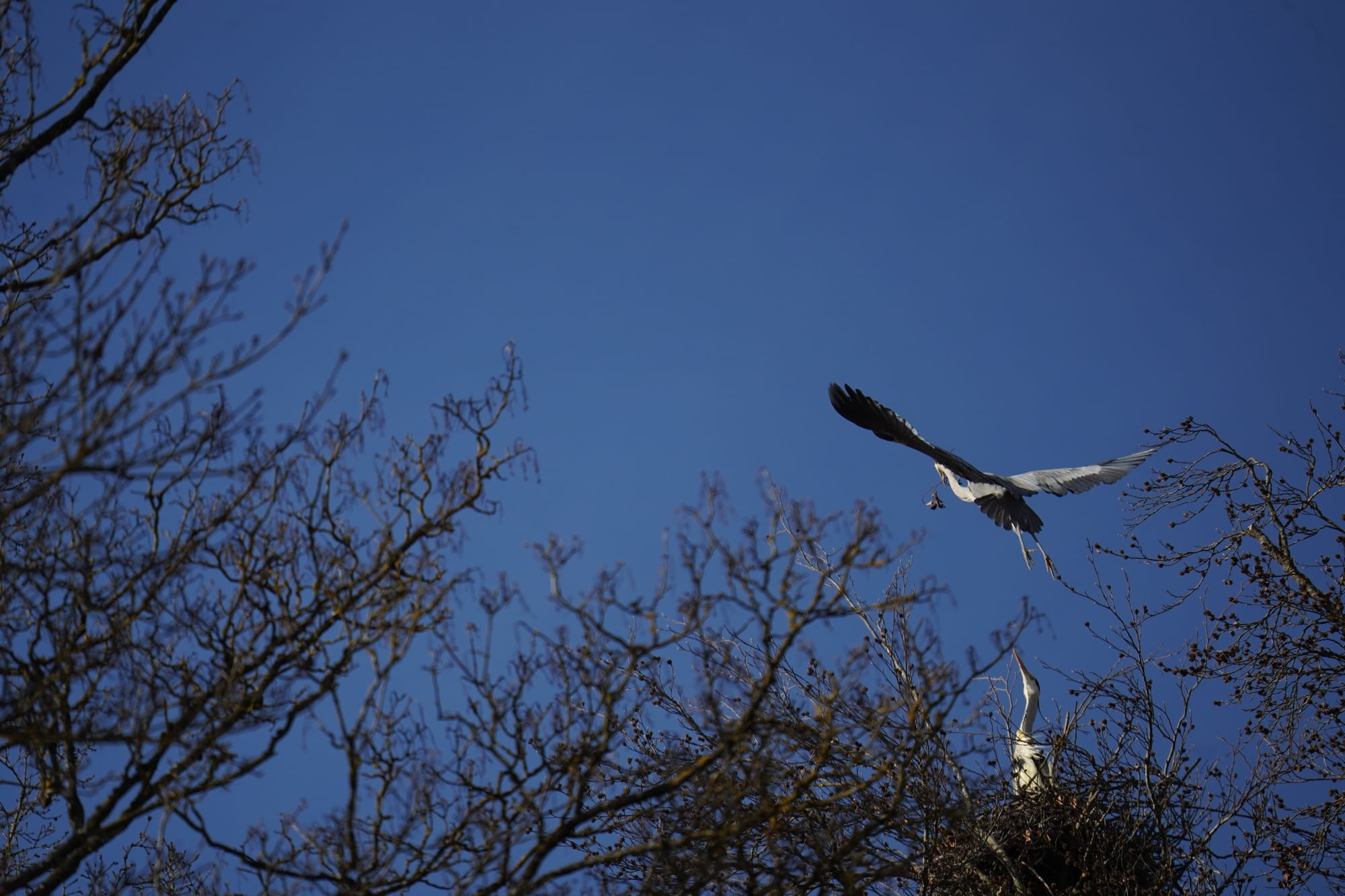 Graureiher beim Nestbau